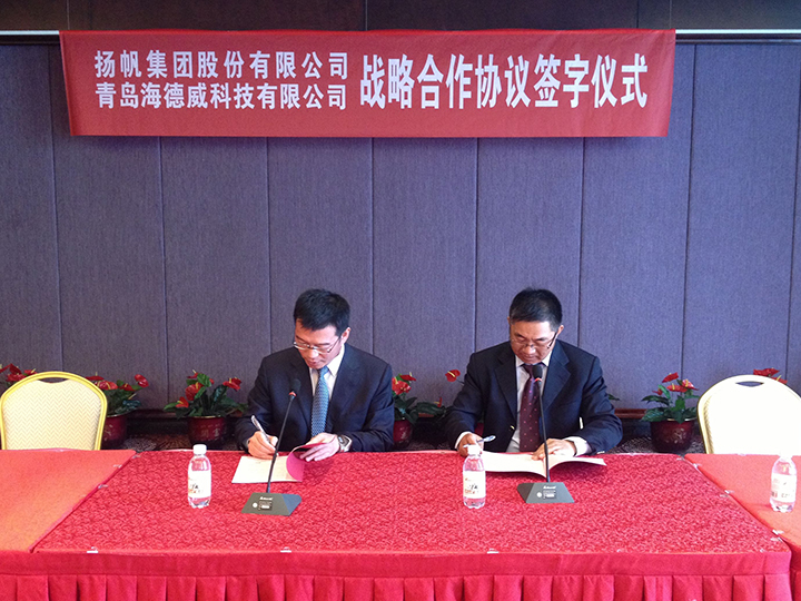 本著平等互利,共同發(fā)展的原則,4月25日,揚(yáng)帆集團(tuán)股份有限公司與青島海德威科技有限公司簽訂了戰(zhàn)略合作協(xié)議。由雙方代表揚(yáng)帆集團(tuán)董事長李明東和海德威CEO曹學(xué)良在合同上簽字。