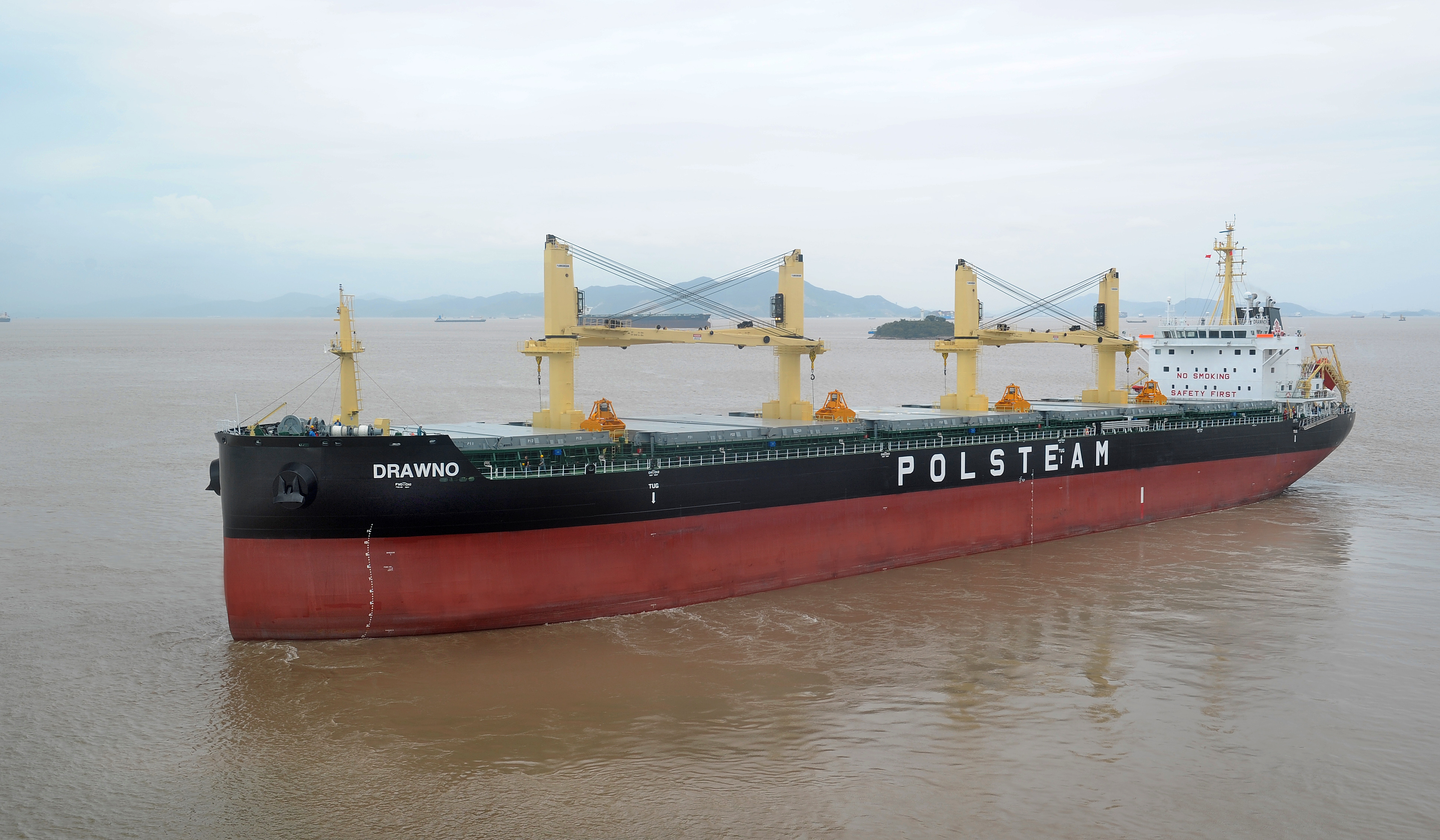 2018年9月7日,揚帆集團為波蘭船東建造的38520DWT系列散貨船“DRA WNO”正式簽字。該船型總長179.99m,型寬30.00m,型深15.00m,保證航速13.59kn,保證燃油消耗160.3gkwh。該船型是揚帆集團自行設(shè)計的經(jīng)濟節(jié)能、綠色環(huán)保型散貨船,大開口的雙殼設(shè)計,尾部左舷裝有一個鰭,船舵上帶舵球,起到降能增效作用。