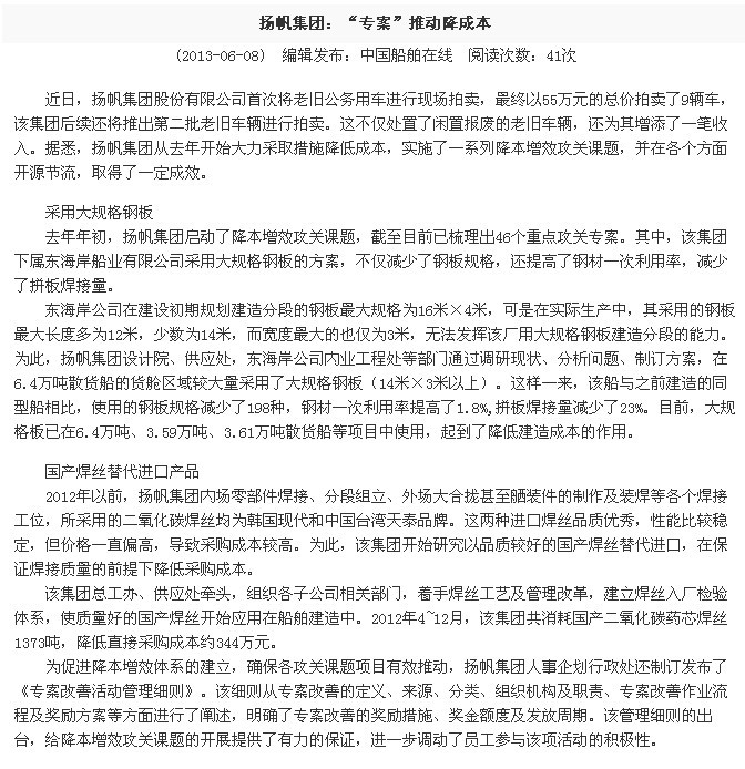 中國船舶在線:揚(yáng)帆集團(tuán):“專案”推動(dòng)降成本